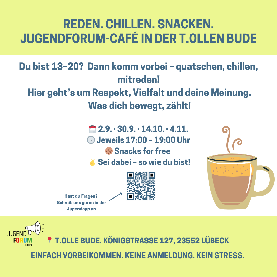 Im Zeitraum von August bis November 2025 fanden insgesamt fünf Sitzungen des Jugendforum-Cafés in der t.ollen Bude in Lübeck statt.